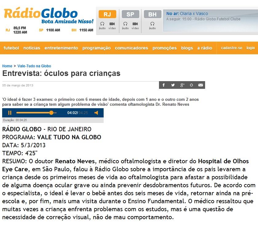RÁDIO GLOBO (RJ) - Entrevista com Dr. Renato Neves sobre visão infantil