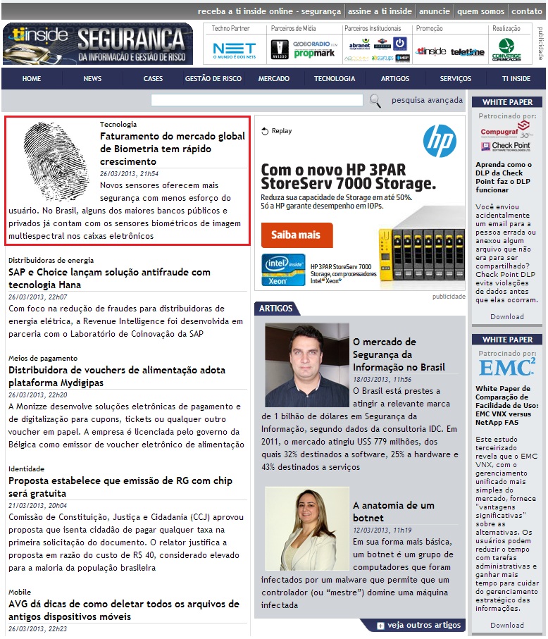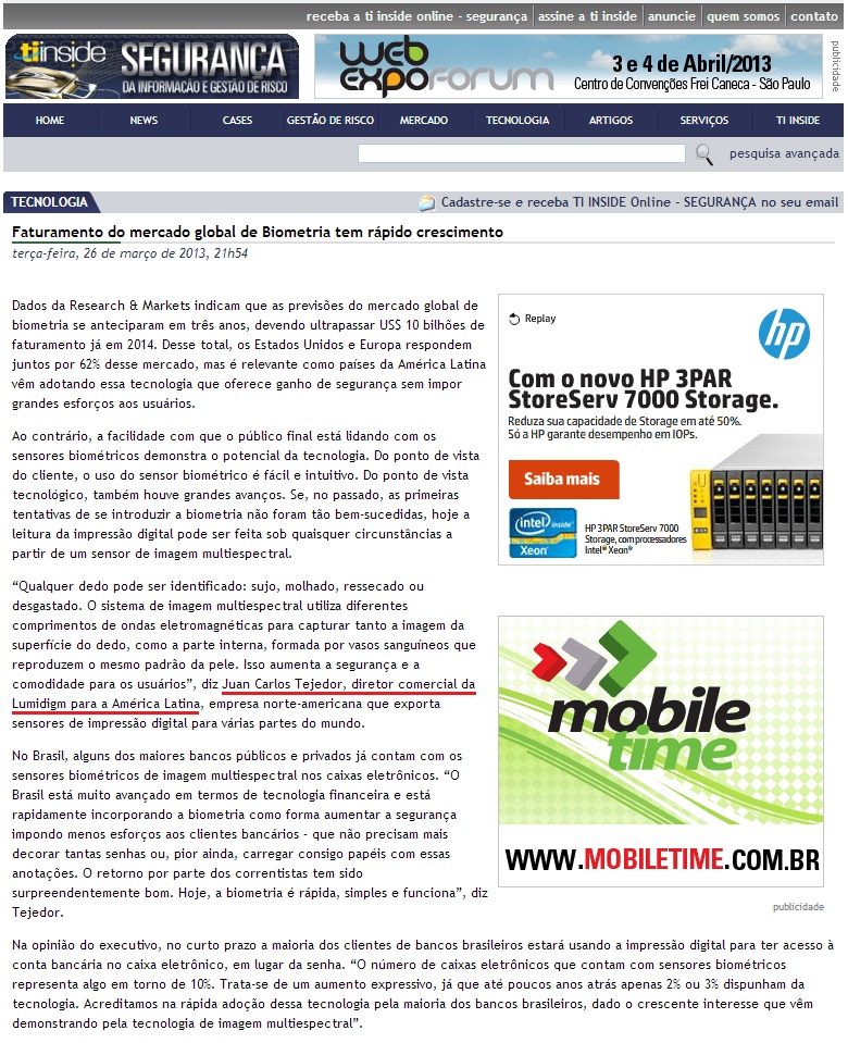 Clipping REVISTA TI INSIDE (ONLINE) - Faturamento do mercado global de biometria tem rápido crescimento 27/03/2013
