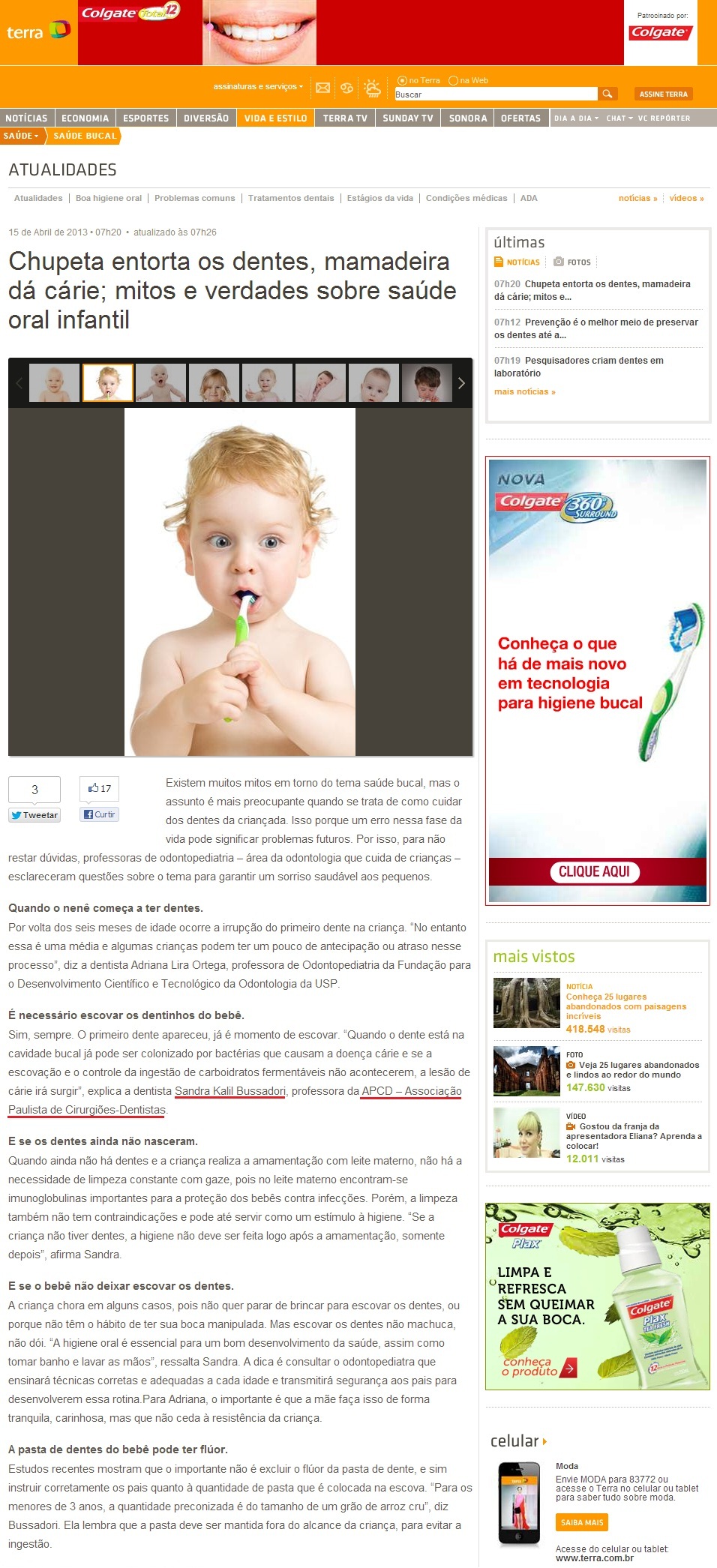 Clipping PORTAL TERRA - Chupeta entorta os dentes, mamadeira dá cárie, mitos e verdades sobre saúde oral infantil 15/04/2013