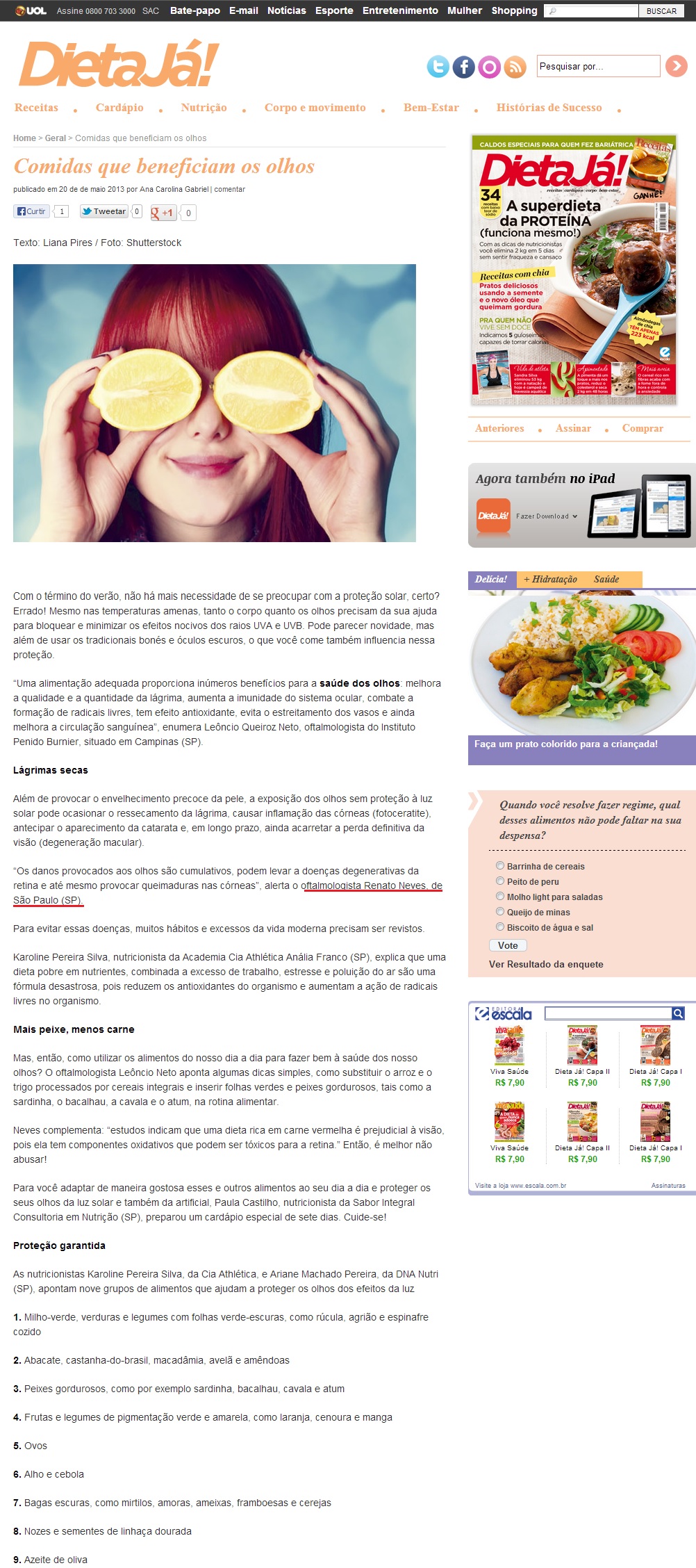 REVISTA DIETA JÁ! (IMPRESSO E ONLINE) - Comidas que beneficiam os olhos