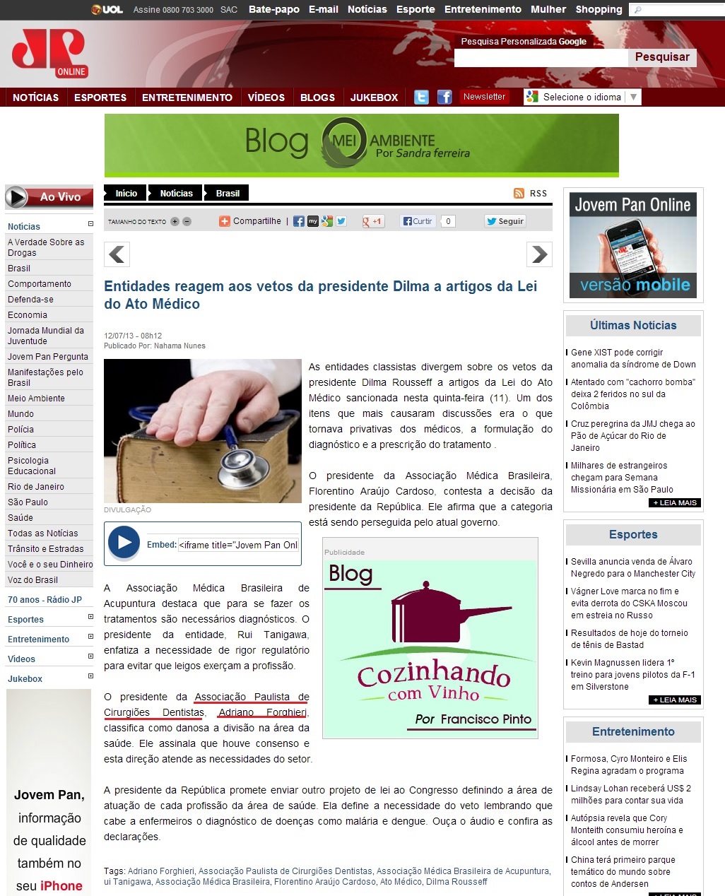 Clipping PORTAL JOVEM PAN ONLINE - Entidades reagem aos vetos da presidente Dilma a artigos de Lei do Ato Médico 17/07/2013
