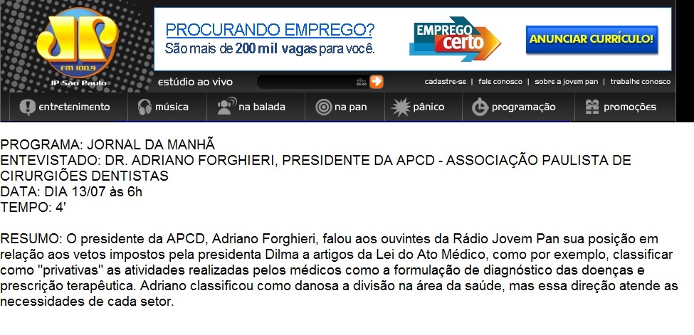 Clipping RÁDIO JOVEM PAN - Entidades reagem aos vetos da presidente Dilma a artigos da Lei do Ato Médico 19/07/2013