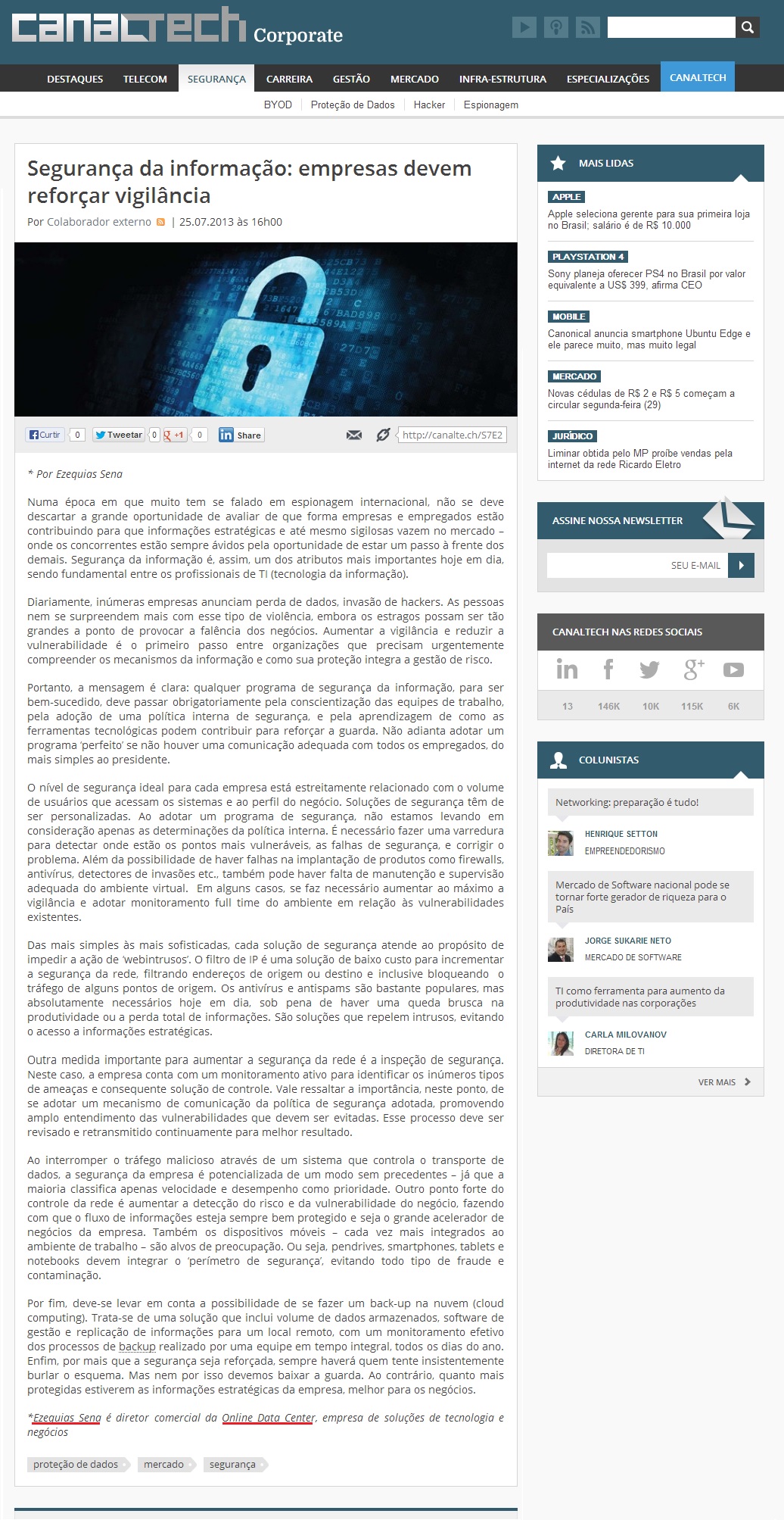 Clipping PORTAL CANAL TECH CORPORATE - Segurança da informação: empresas devem reforçar vigilância 29/07/2013