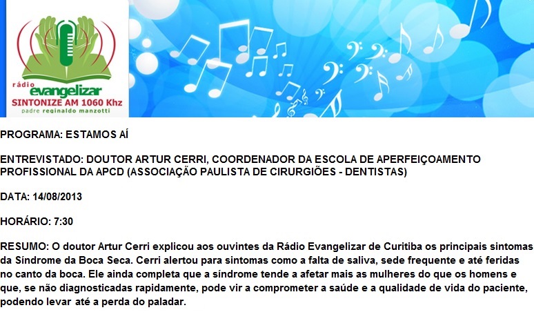 Clipping RÁDIO EVANGELIZAR AM 1060 - Síndrome da boca seca pode resultar na perda dos dentes quando não tratada 14/08/2013