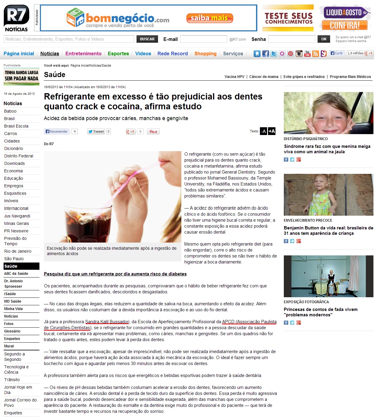 Clipping PORTAL R7 - Refrigerante em excesso é tão prejudicial aos dentes quanto crack e cocaína, afirma estudo 16/08/2013