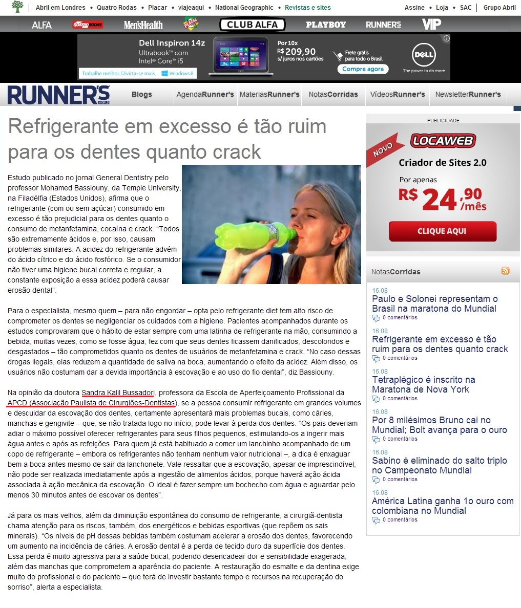 Clipping REVISTA RUNNER'S WORLD (ONLINE) - Refrigerante em excesso é tão ruim para os dentes quanto crack 16/08/2013