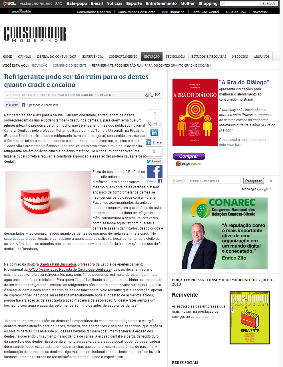 Clipping PORTAL CONSUMIDOR MODERNO - Refrigerante em excesso é tão ruim para os dentes quanto crack e cocaína 16/08/2013