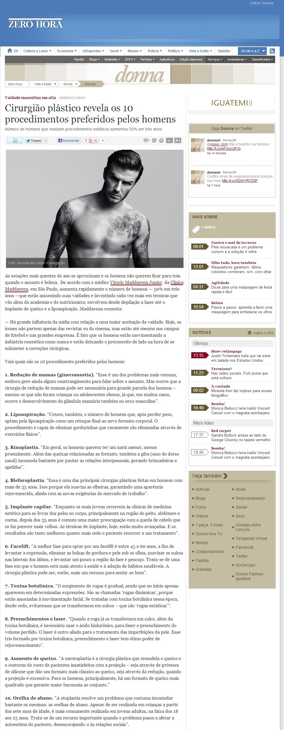 Clipping JORNAL ZERO HORA (ONLINE) - Cirurgião plástico revela os 10 procedimentos preferidos pelos homens 29/08/2013