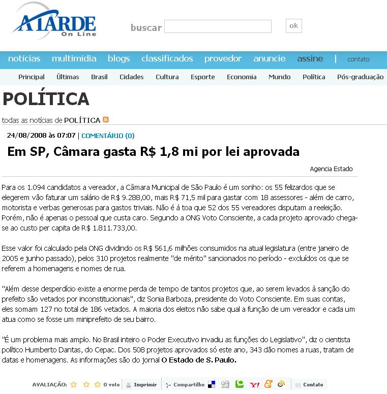 A Tarde on line (Salvador - BA) - Em SP, Câmara gasta R$ 1,8 mi por lei aprovada