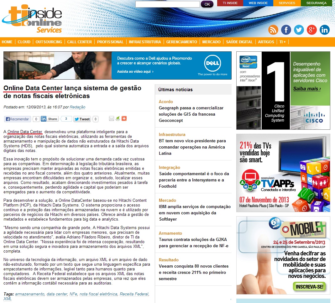 Clipping PORTAL TI INSIDE ONLINE (SERVICES) - Online Data Center lança sistema de gestão de notas fiscais eletrônicas 17/09/2013