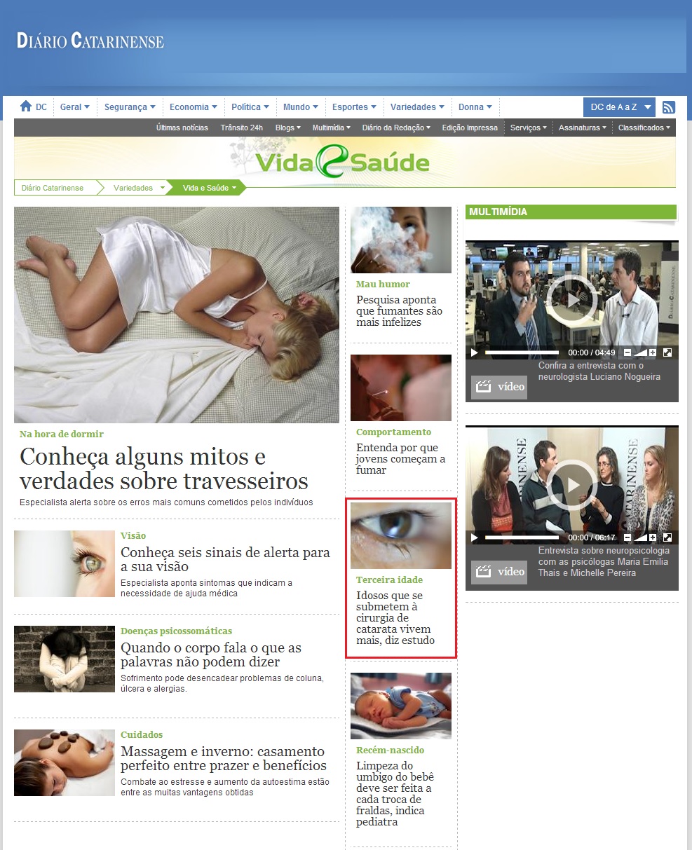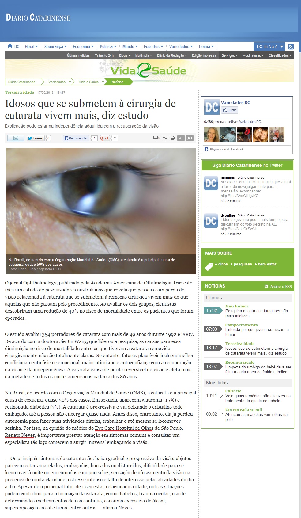Clipping JORNAL DIÁRIO CATARINENSE (ONLINE) - Idosos que se submetem à cirurgia de catarata vivem mais, diz estudo 18/09/2013