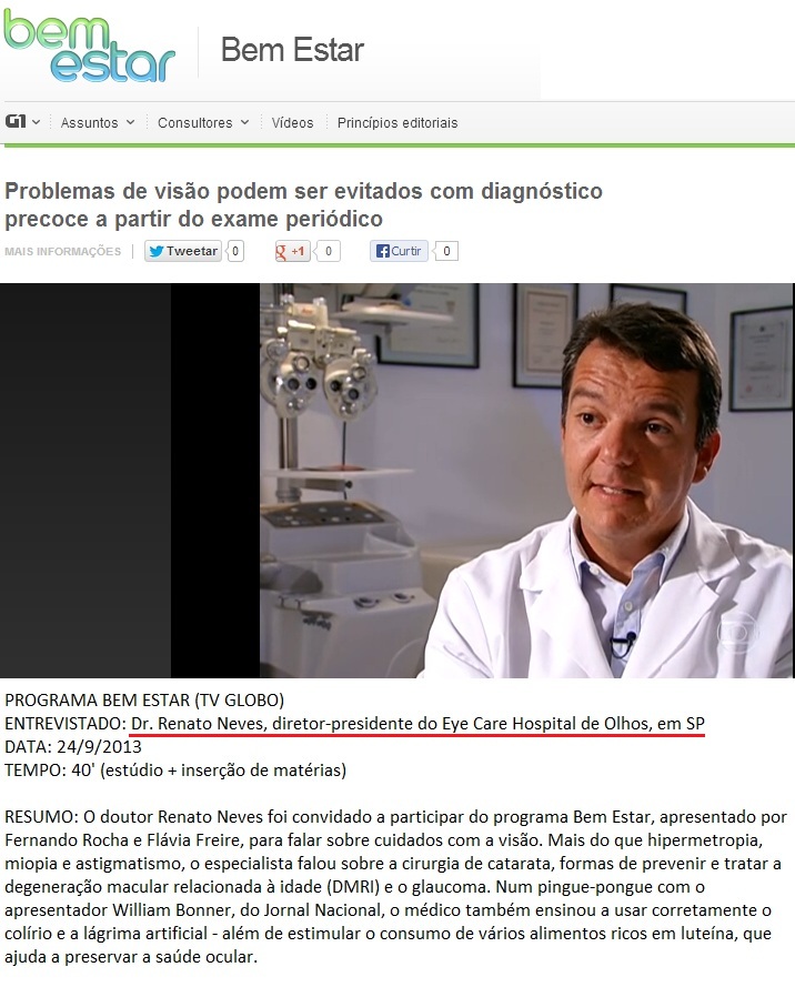 Clipping PROGRAMA BEM ESTAR (TV GLOBO) - Dr. Renato Neves fala sobre cuidados com a saúde ocular 24/09/2013