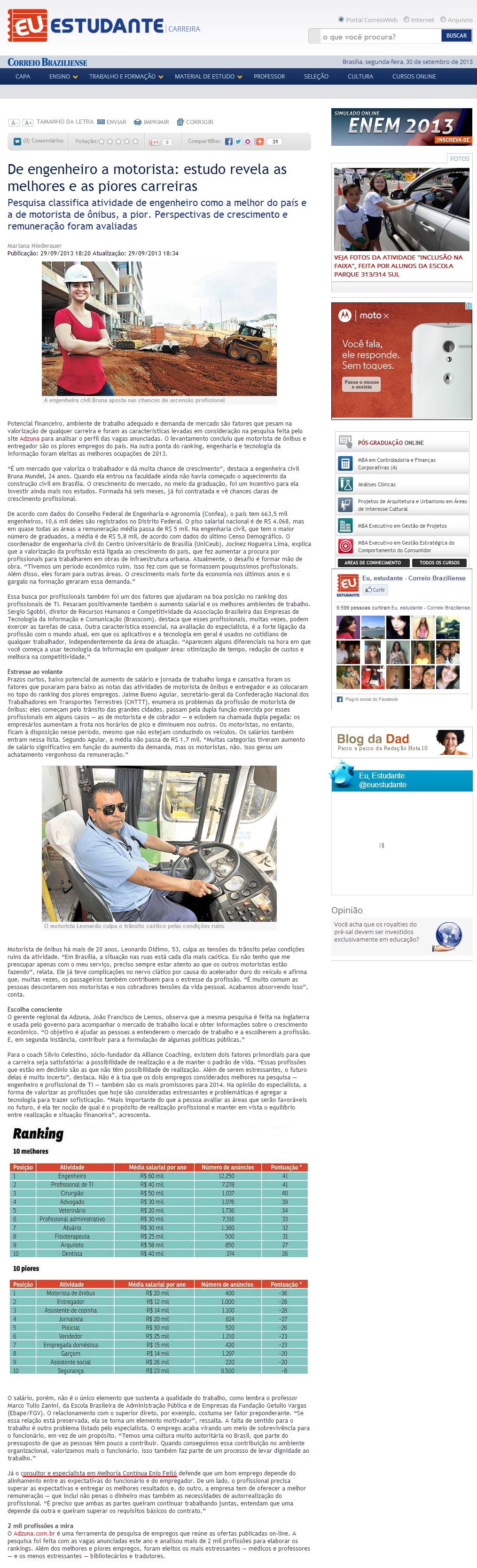 Clipping JORNAL CORREIO BRAZILIENSE (ONLINE) - De engenheiro a motorista: estudo revela as melhores e as piores carreiras 30/09/2013