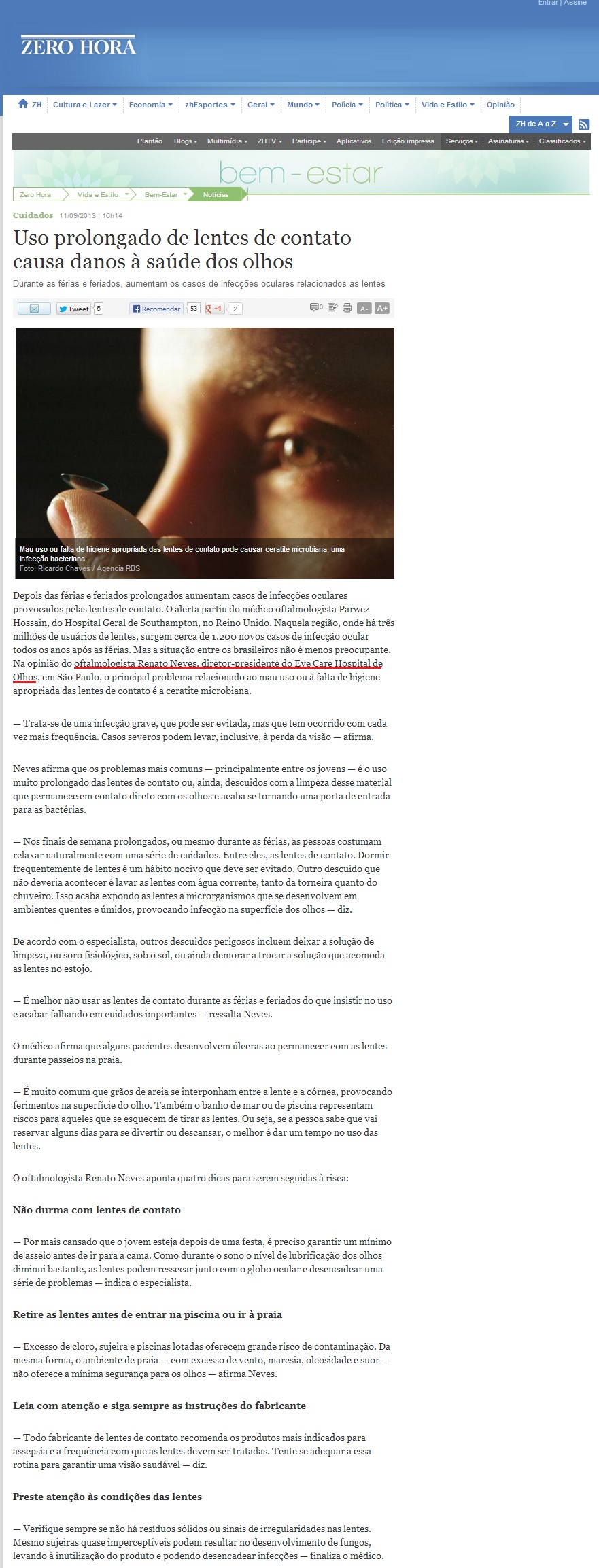 Clipping JORNAL ZERO HORA (ONLINE) - Uso prolongado das lentes de contato causa danos à saúde dos olhos 30/09/2013