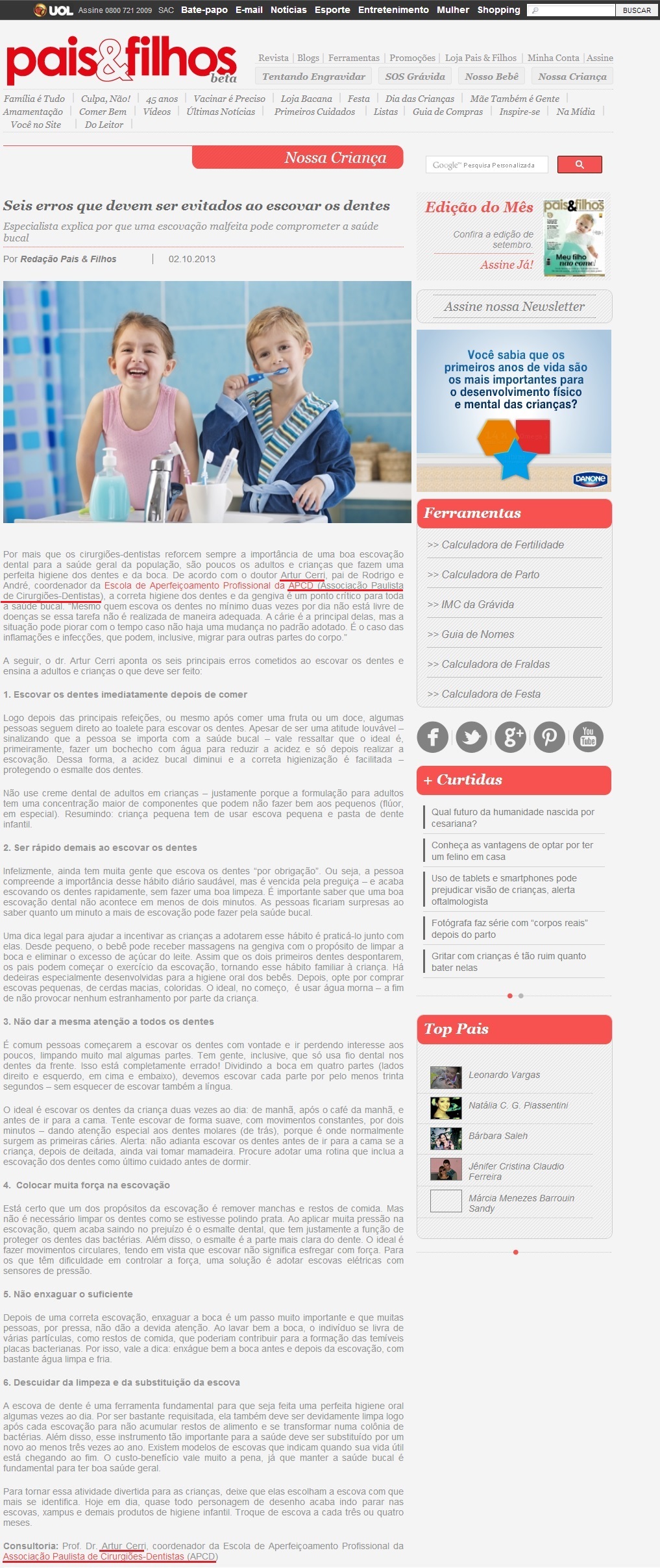 Clipping REVISTA PAIS & FILHOS (ONLINE) - Seis erros que devem ser evitados ao escovar os dentes 03/10/2013