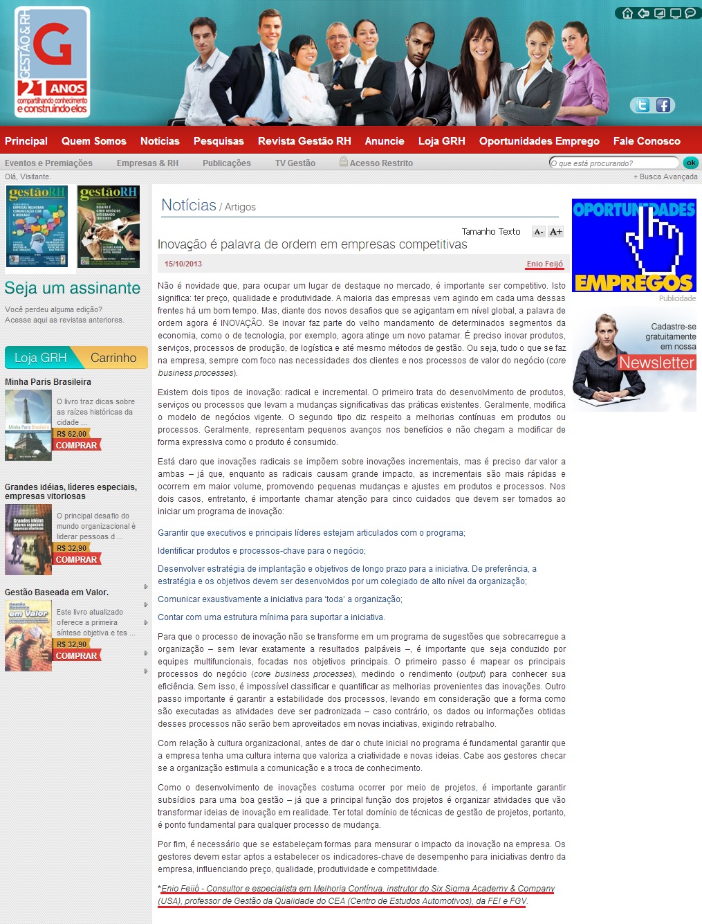 Clipping REVISTA GESTÃO RH (ONLINE) - Inovação é palavra de ordem em empresas competitivas 16/10/2013