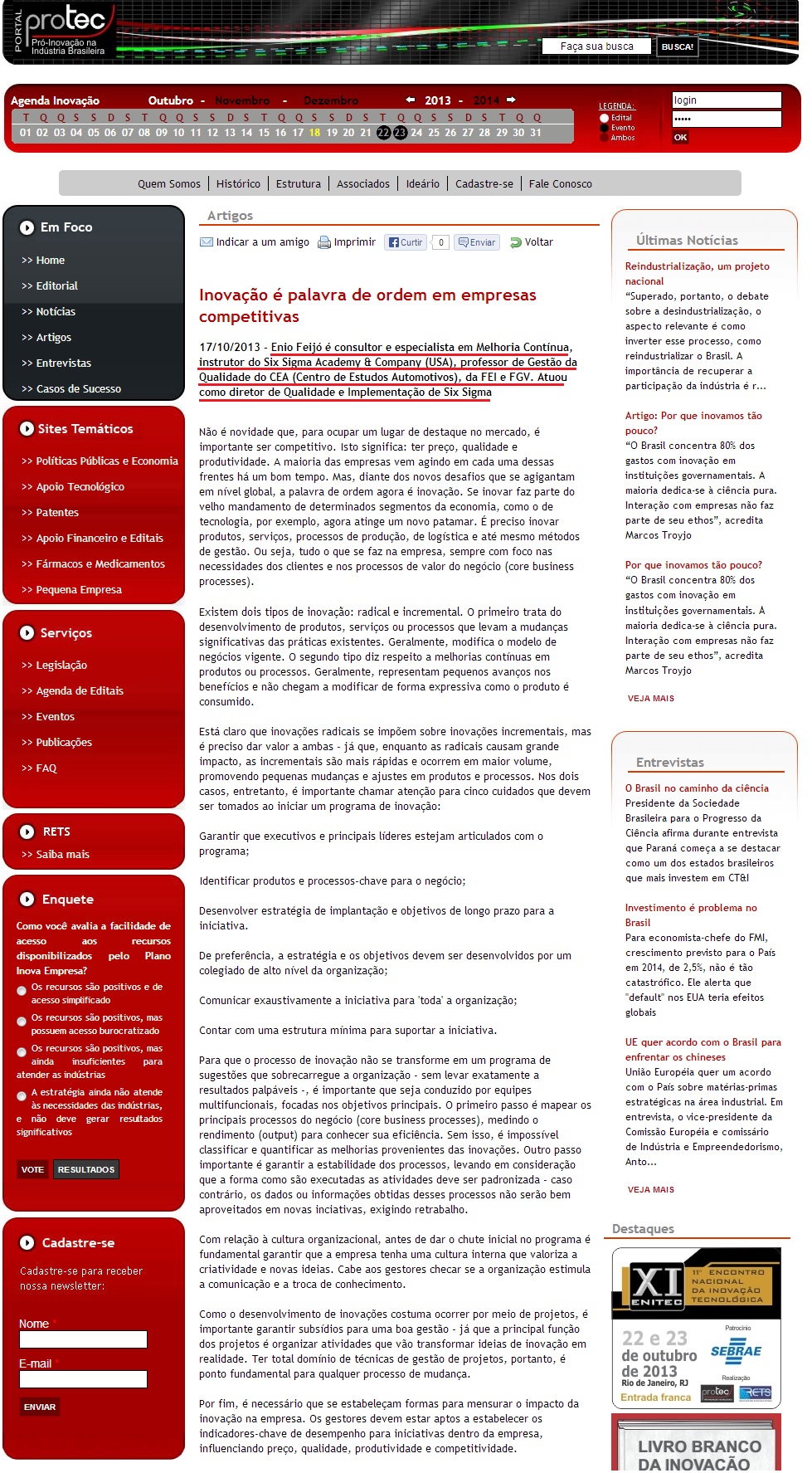 Clipping PORTAL PROTEC SOCIEDADE BRASILEIRA PRÓ-INOVAÇÃO TECNOLÓGICA - Inovação é palavra de ordem em empresas competitivas 18/10/2013