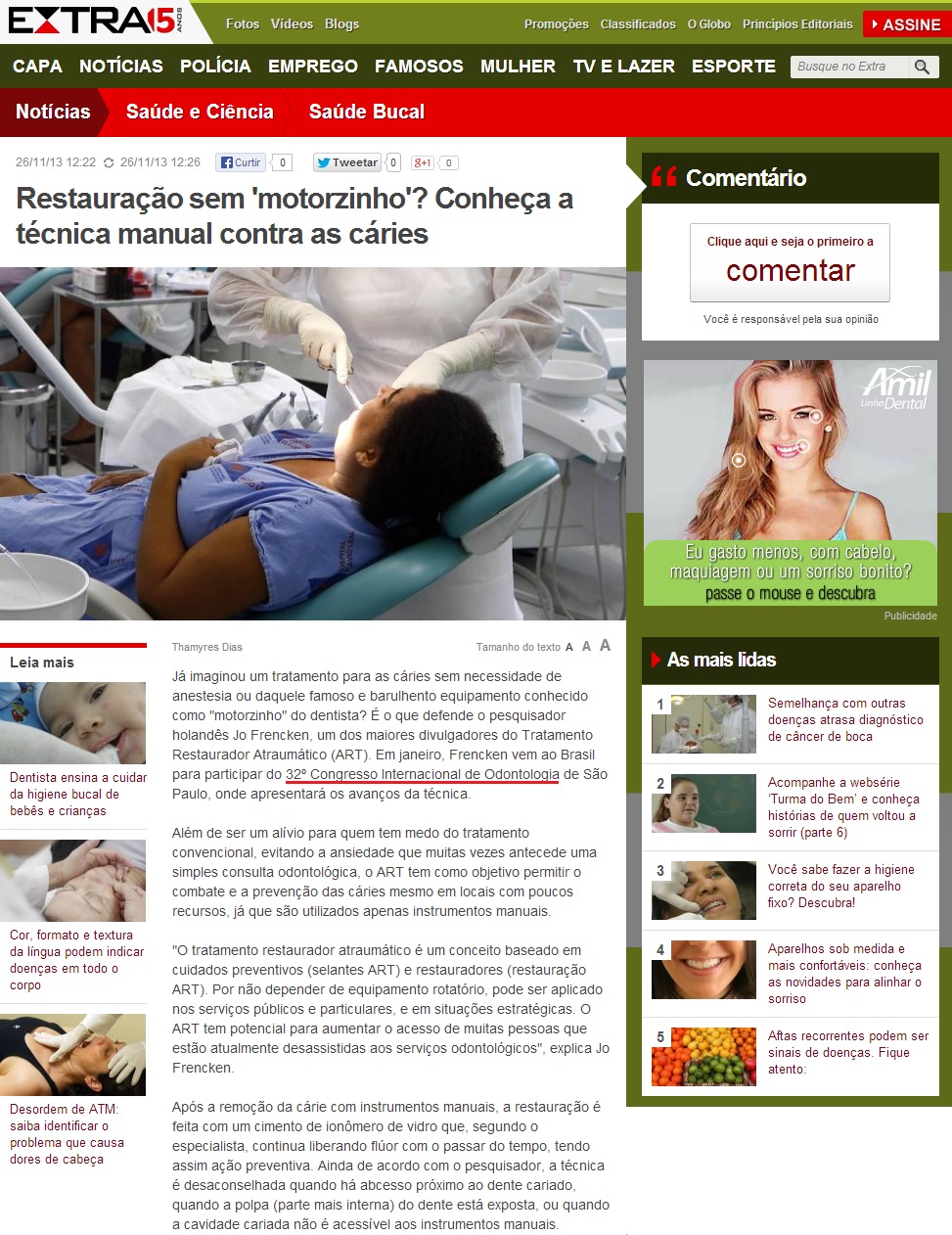 Clipping JORNAL EXTRA (ONLINE) - Restauração sem 'motorzinho'? Conheça a técnica manual contra as cáries 26/11/2013