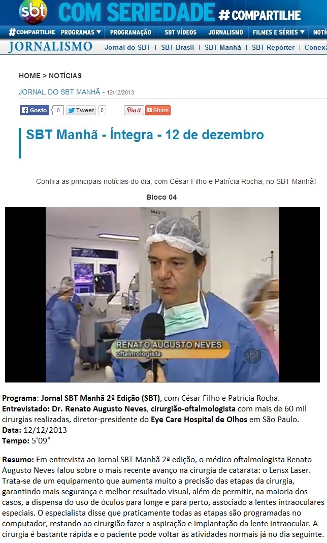 Clipping JORNAL SBT MANHÃ 2ª EDIÇÃO (TV) - Idosos que se submetem à cirurgia de catarata vivem mais, diz estudo 12/12/2013