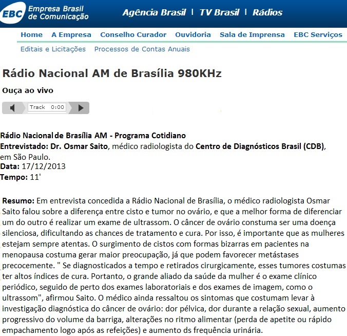 Clipping RÁDIO NACIONAL AM DE BRASÍLIA - CÂNCER DE OVÁRIO - Ultrassom é grande aliado do diagnóstico precoce 17/12/2013