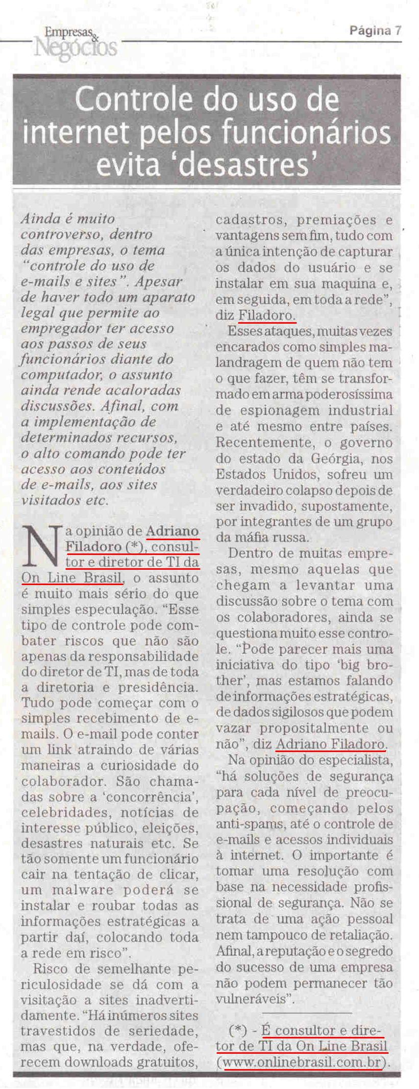 Clipping Jornal Empresas & Negócios (21 Out) - Controle do uso de internet pelos funcionários evita desastres 23/10/2008