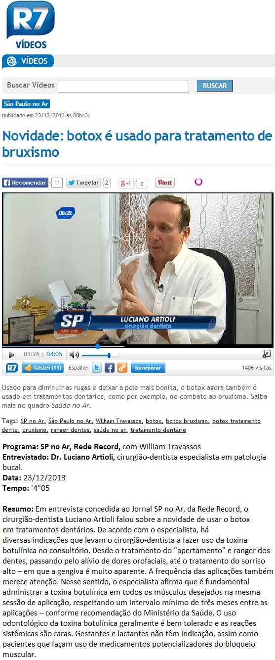 Clipping SP NO AR (REDE RECORD) - Uso da toxina botulínica se estende desde o tratamento de bruxismo até o alívio de dores orofaciais 06/01/2014