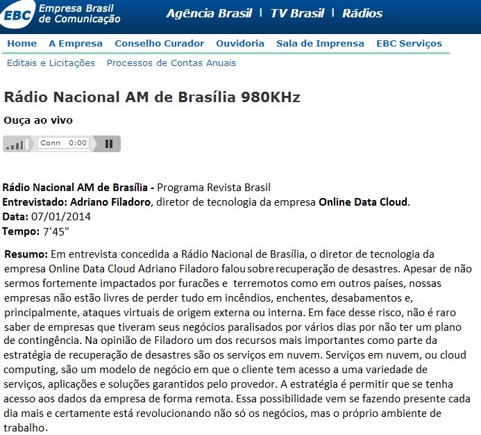 Clipping RÁDIO NACIONAL AM DE BRASÍLIA - Recuperação de desastres: questão que ainda intriga muitas empresas e exige medidas urgentes 07/01/2014