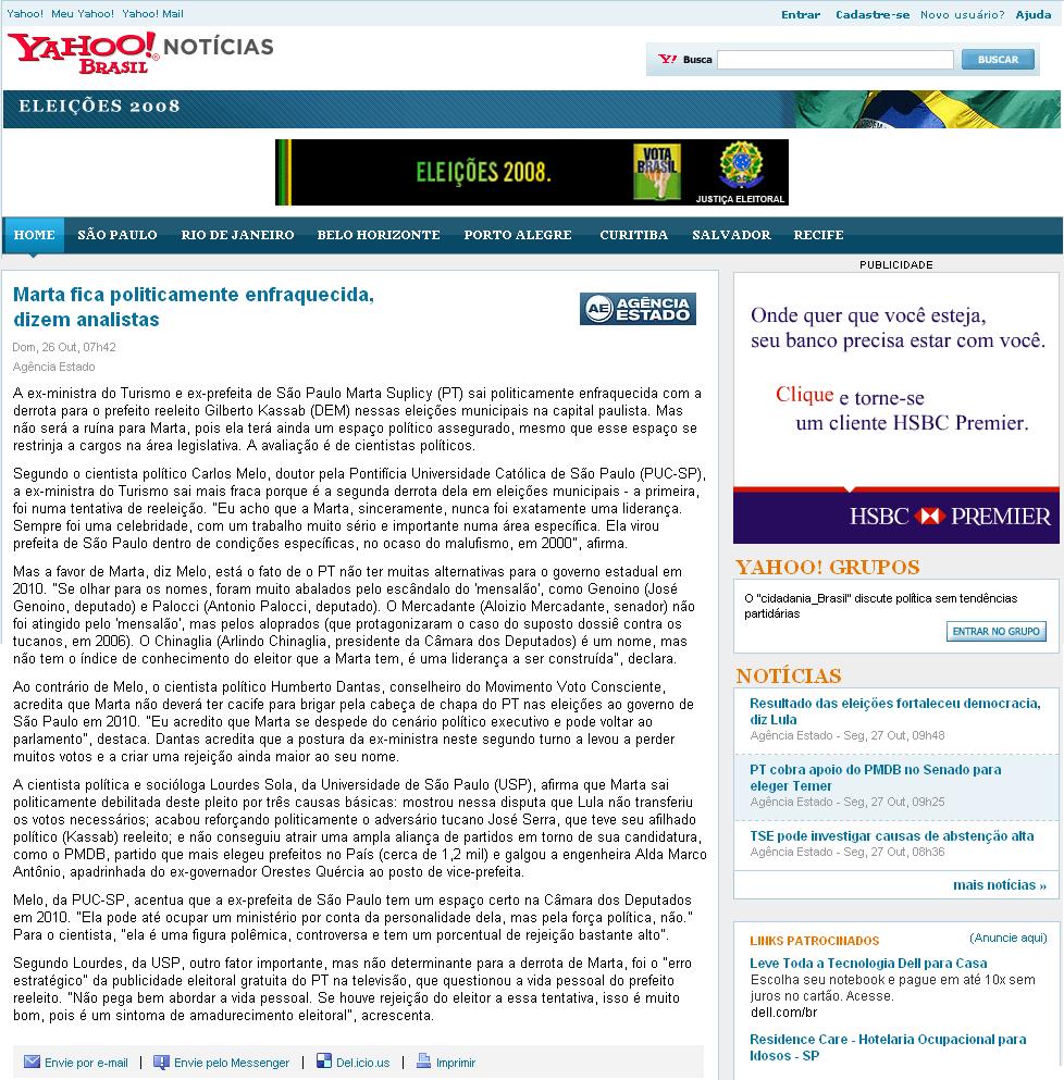 Portal Yahoo - Marta fica politicamente enfraquecida, dizem analistas