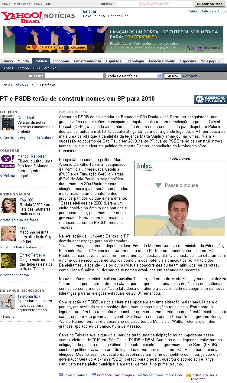 Portal Yahoo - PT e PSDB terão de construir nomes em SP para 2010
