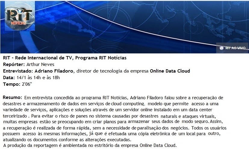 Clipping REDE INTERNACIONAL DE TV (PROGRAMA RIT NOTÍCIAS) - Matéria sobre recuperação de desastres em TI 15/01/2014