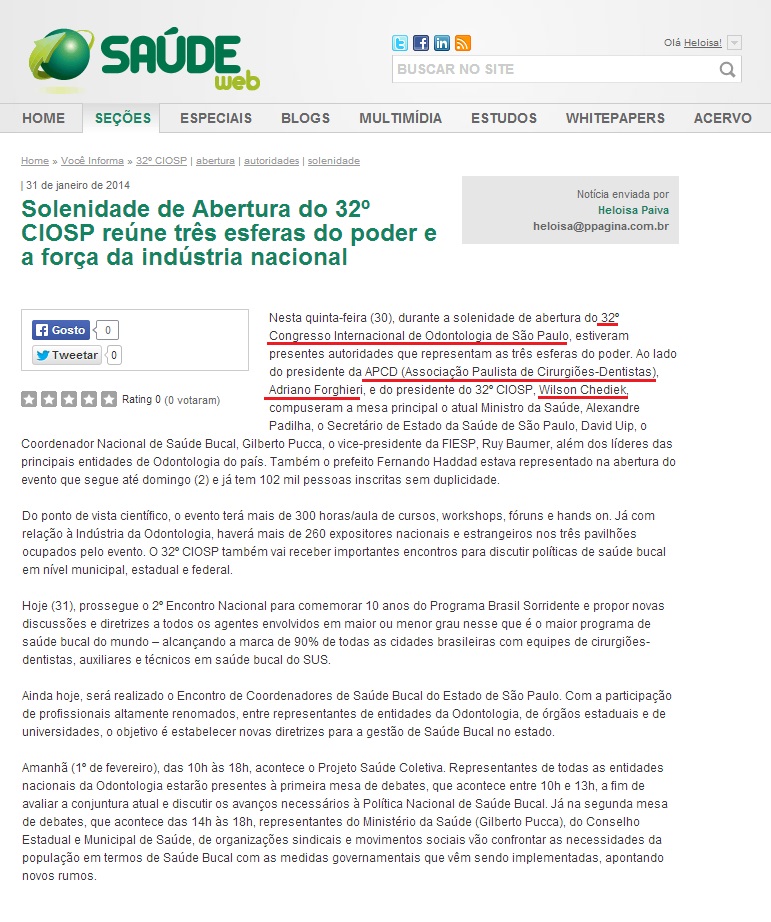 Clipping PORTAL SAÚDE WEB - Solenidade de Abertura do 32º CIOSP reúne três esferas do poder e a força da indústria nacional 31/01/2014