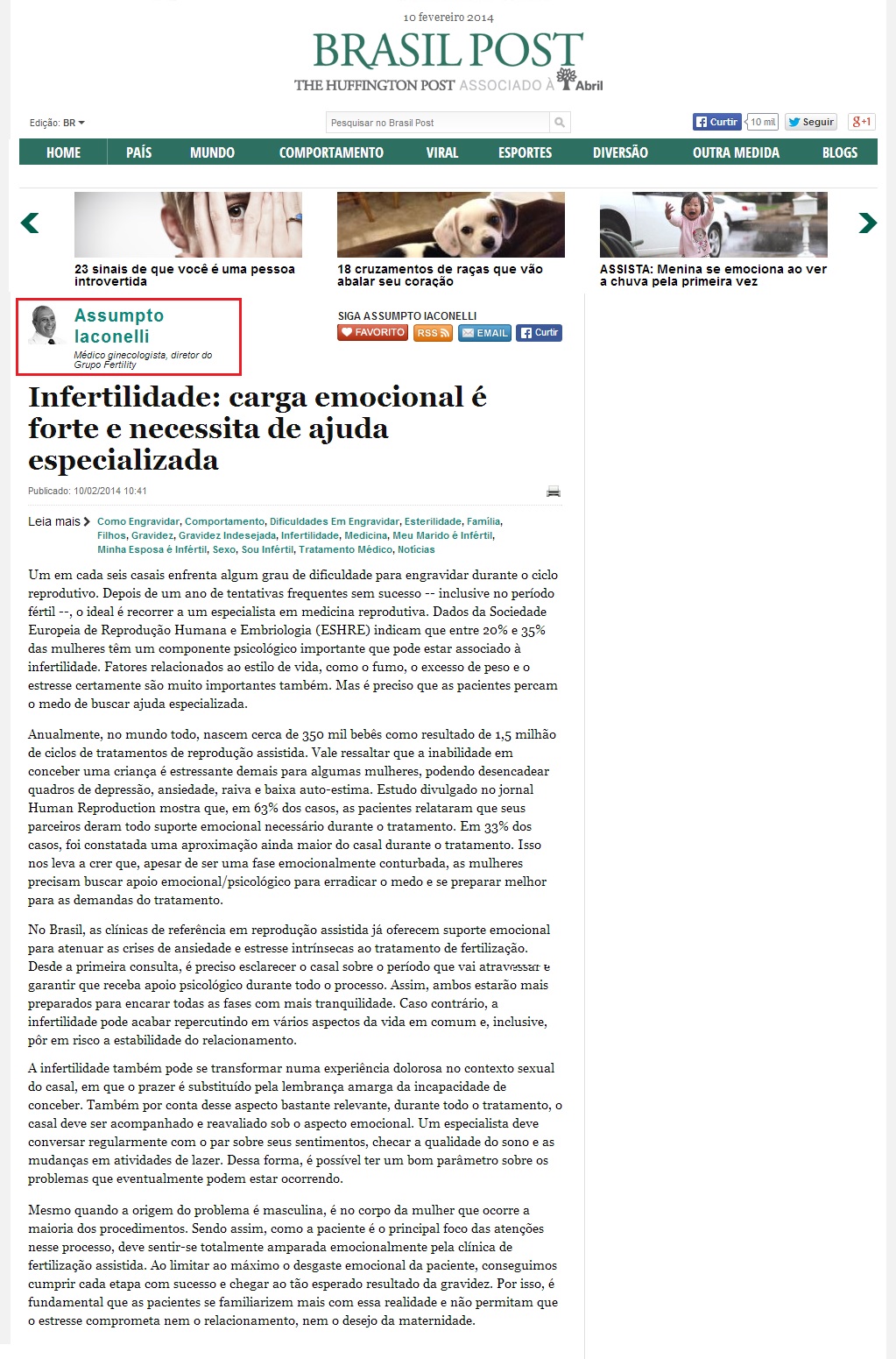 Clipping PORTAL BRASIL POST - Infertilidade: carga emocional é forte e necessita de ajuda especializada 10/02/2014