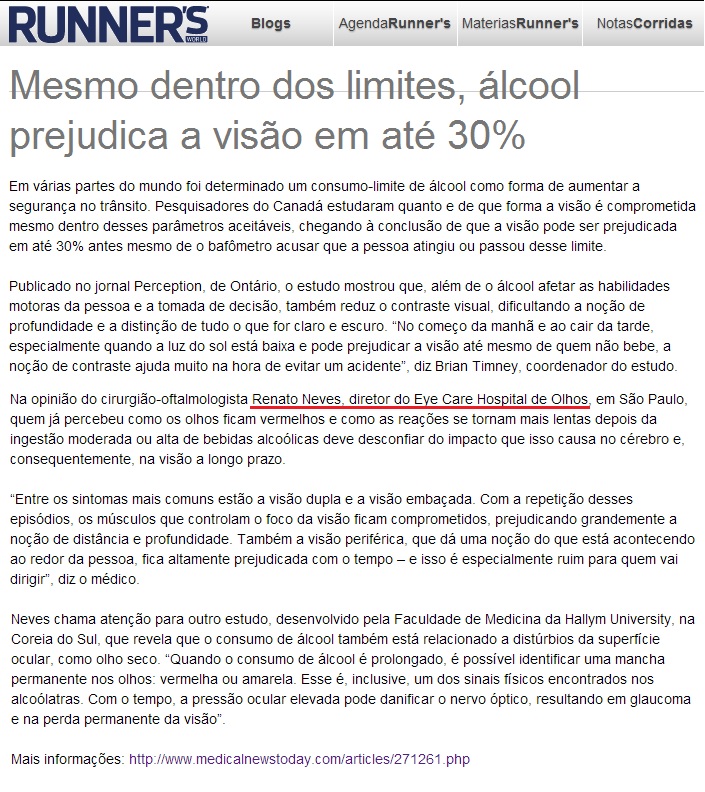 Clipping PORTAL RUNNER'S WORLD - Mesmo dentro dos limites, álcool prejudica a visão em até 30% 12/02/2014