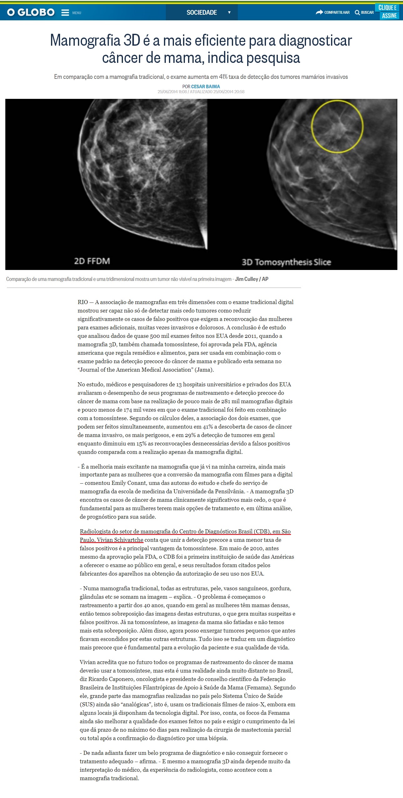 Clipping JORNAL O GLOBO (ONLINE) - Mamografia 3D é a mais eficiente para diagnosticar câncer de mama, indica pesquisa 26/06/2014
