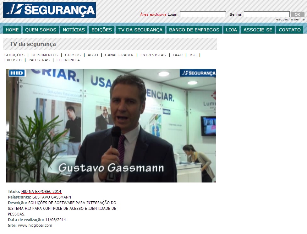 Clipping PORTAL JORNAL DA SEGURANÇA (TV DA SEGURANÇA) - CEO da HID GLOBAL fala sobre as marcas que trouxe para a EXPOSEC 2014 27/06/2014