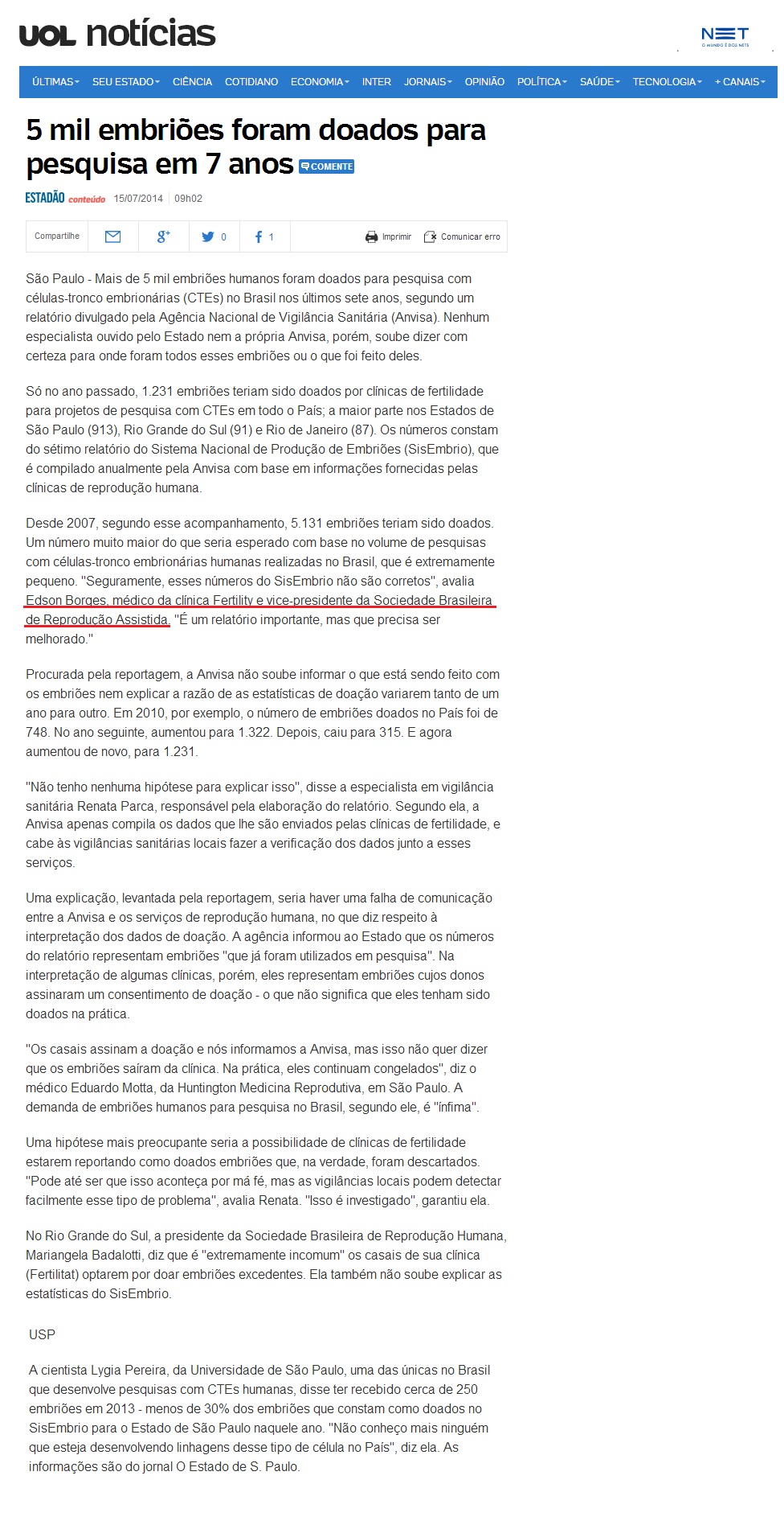 PORTAL UOL NOTÍCIAS - 5 mil embriões foram doados para pesquisa em 7 anos