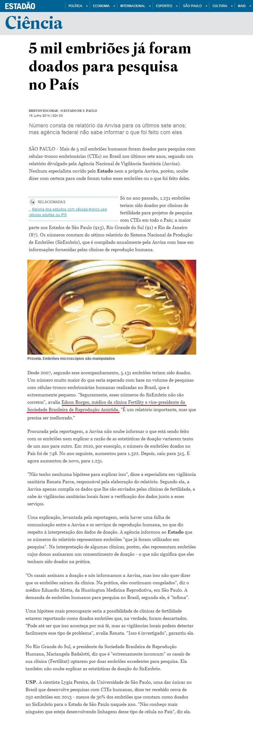Clipping JORNAL O ESTADO DE S. PAULO (ONLINE) - 5 mil embriões foram doados para pesquisa em 7 anos 17/07/2014