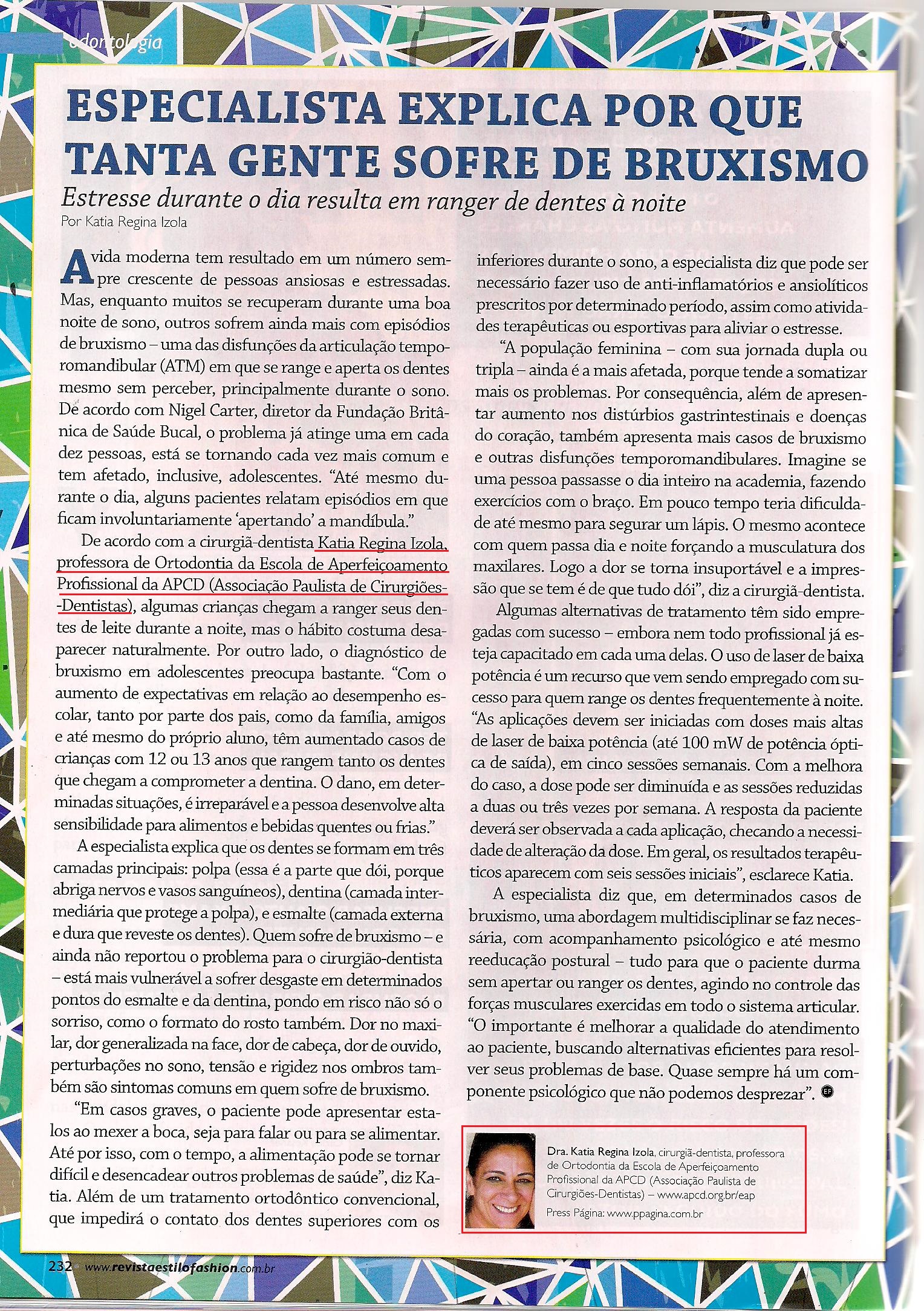 Clipping REVISTA ESTILO FASHION (IMPRESSO) - Especialista explica por que tanta gente sofre bruxismo 06/08/2014