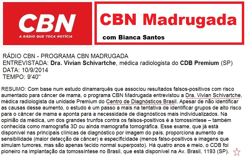 Clipping RÁDIO CBN (PROGRAMA CBN MADRUGADA) - Estudo associa ‘falsos-positivos’ com risco aumentado para câncer de mama 12/09/2014
