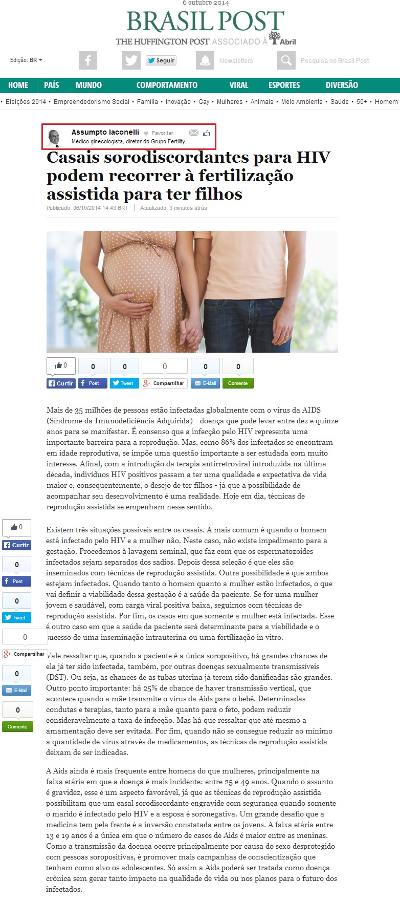 Clipping BRASIL POST - Técnica garante fertilização assistida para casais sorodiscordantes para HIV 06/10/2014