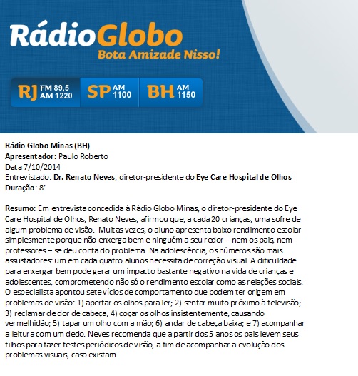 RÁDIO GLOBO MINAS - Óculos: correção visual pode melhorar desempenho escolar