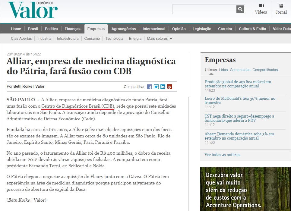JORNAL VALOR ECONÔMICO (ONLINE) - Alliar fará fusão com CDB