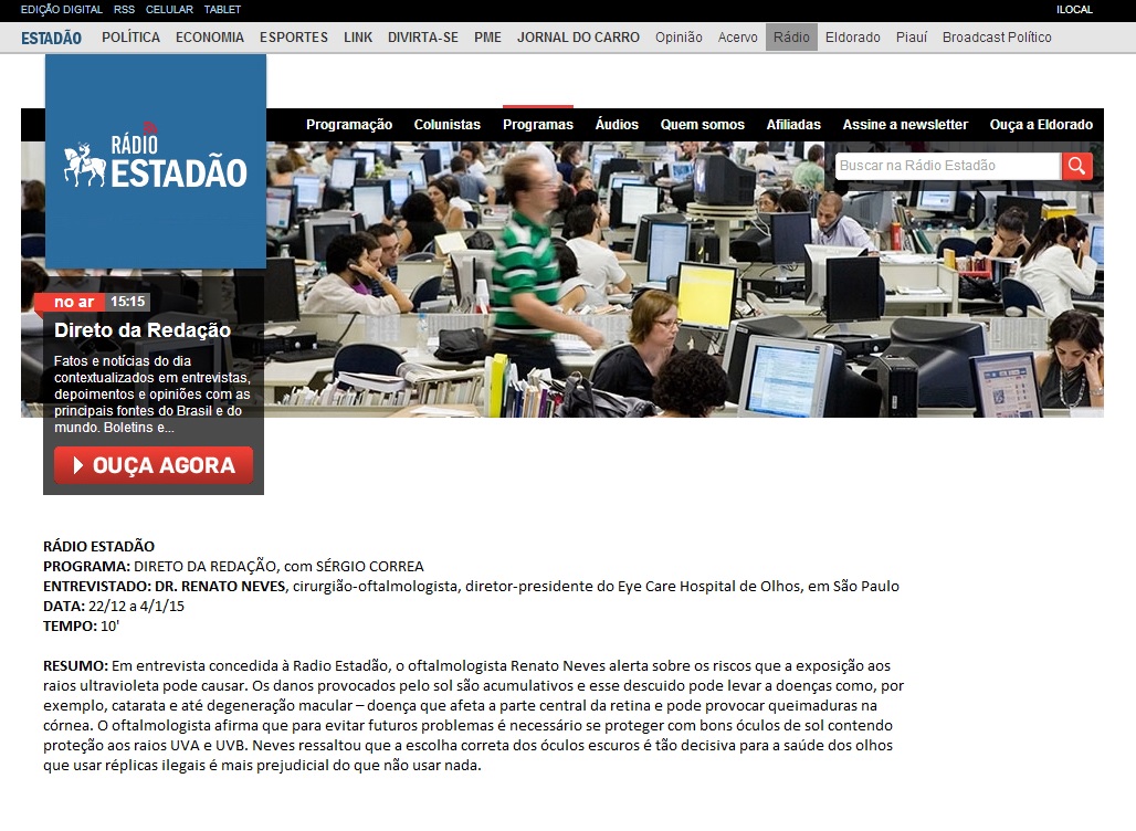 Clipping RÁDIO ESTADÃO - Alerta sobre os riscos que a exposição aos raios ultravioleta pode causar 22/12/2014