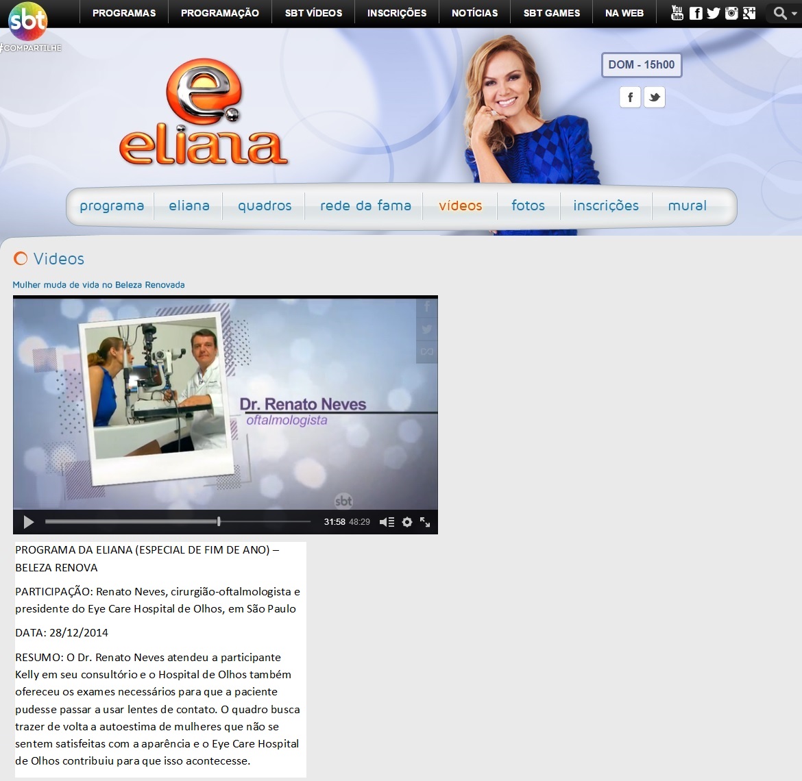 Clipping PROGRAMA DA ELIANA (BELEZA RENOVADA) - Dr. Renato Neves, cirurgião-oftalmologista e presidente do Eye Care Hospital de Olhos 02/02/2015