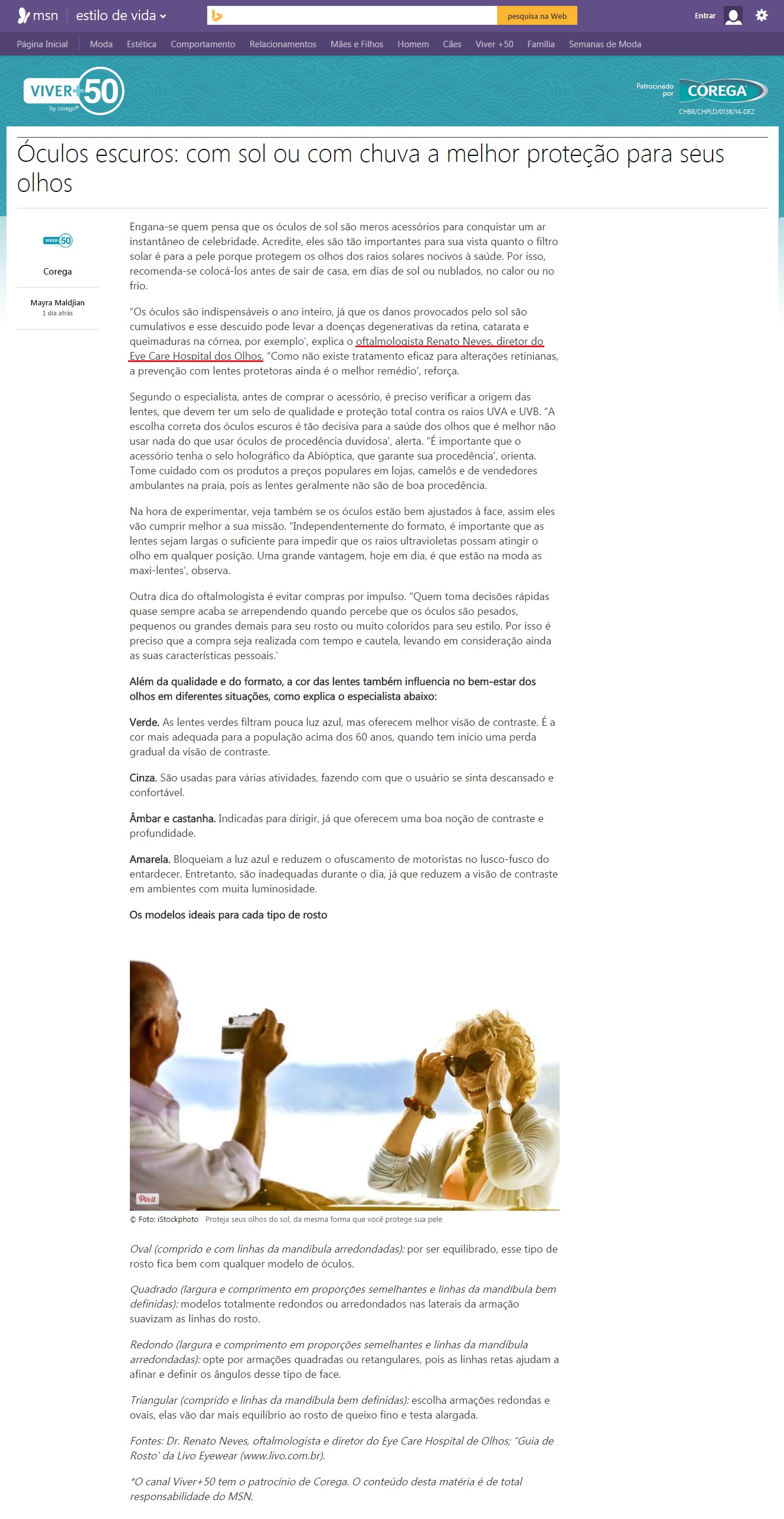 Clipping PORTAL MSN - Óculos escuros: com sol ou com chuva a melhor proteção para seus olhos 25/05/2015