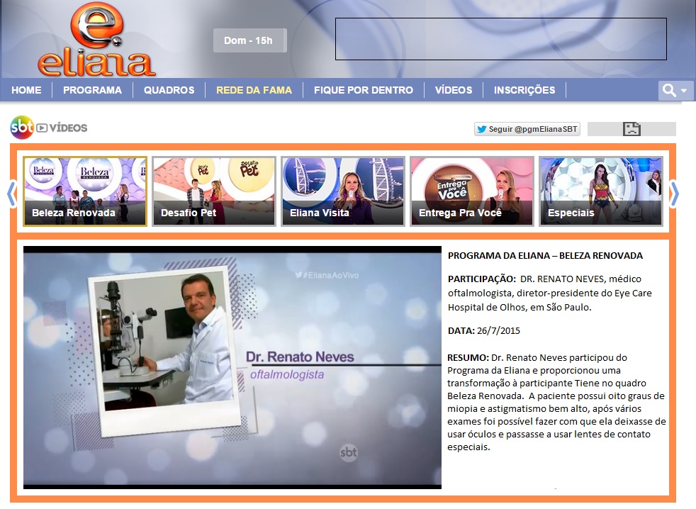 Clipping PROGRAMA DA ELIANA (BELEZA RENOVADA) - Dr. Renato Neves, cirurgião-oftalmologista e presidente do Eye Care Hospital de Olhos 27/07/2015