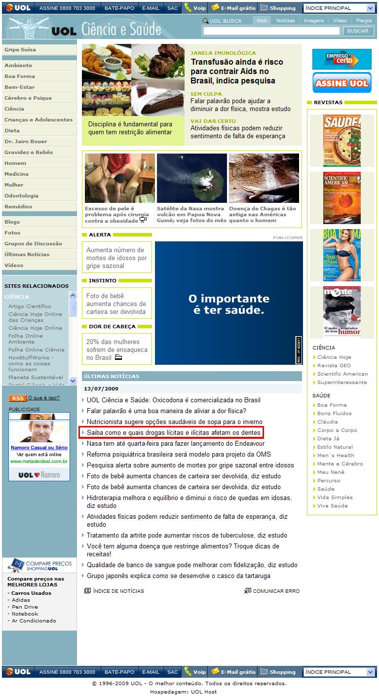 Clipping Portal UOL (Ciência & Saúde) - Saiba como e quais drogas lícitas e ilícitas afetam os dentes 13/07/2009