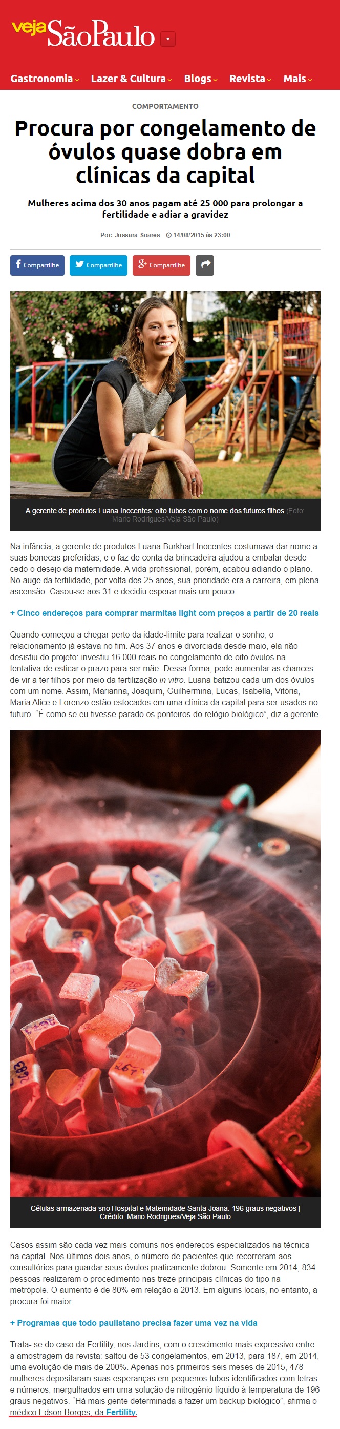 Clipping VEJA SÃO PAULO (ONLINE) - Procura por congelamento de óvulos quase dobra em clínicas da capital 17/08/2015