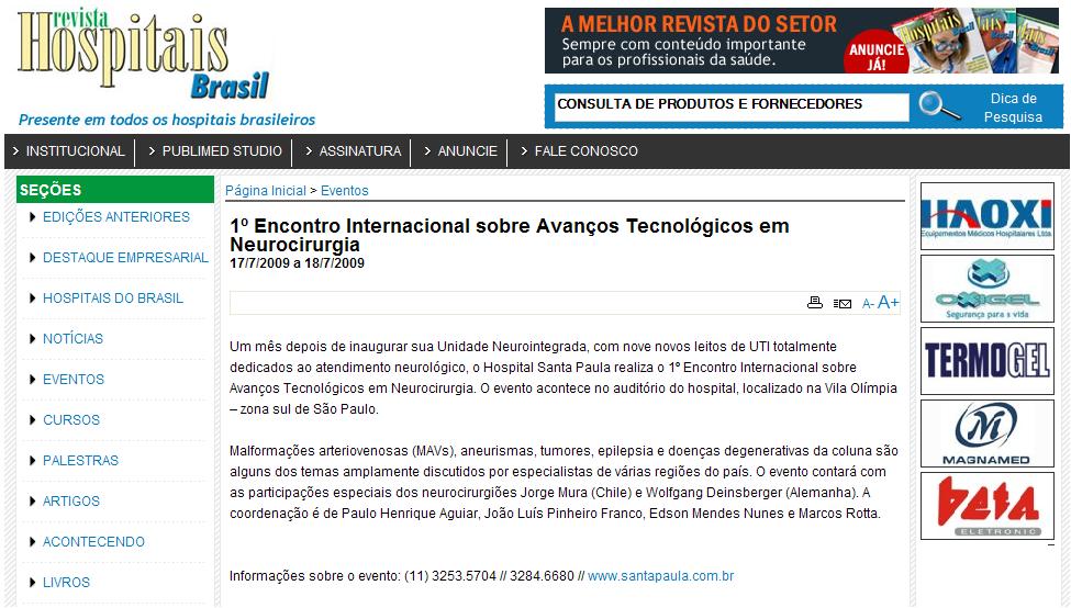 Clipping Site Revista Hospitais Brasil - 1º Encontro Internacional sobre Avanços Tecnológicos em Neurocirurgia 15/07/2009