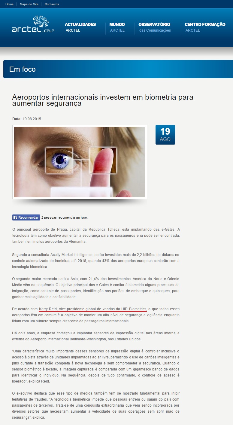 Clipping ARCTEL (PORTUGAL) (SITE) - Aeroportos internacionais investem em biometria para aumentar segurança 21/08/2015